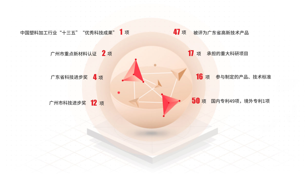 中國塑料加工行業“十三五”“優秀科技成果”1項、廣州市重點新材料認證2項、廣東省科技進步獎4項、廣州市科技進步獎12項