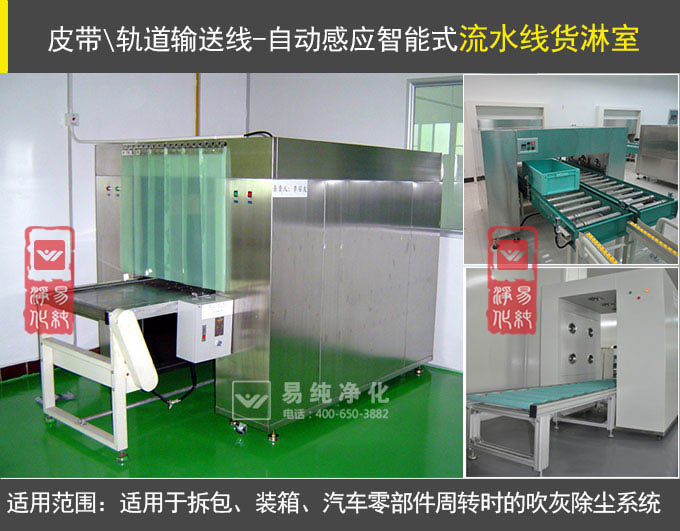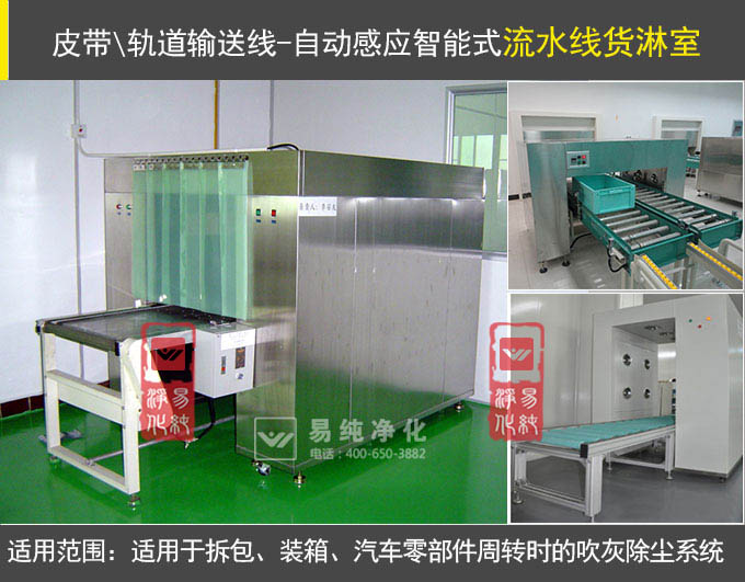 本文將重點介紹流水線貨淋室,此類貨淋室主要搭配輸送流水線配合使用。流水線是在一定的線路上連續輸進貨物搬運機械,又稱輸送線或者輸送機。按照輸送系列產品大體可分為皮帶流水線、滾筒線等流水線。一般包括牽引件承載構件、驅動裝置、改向裝置和和支撐件等,輸送機可進行水平輸送。在輸送的過程中避免了人工操作,只需要設置感應控制程序,當物體達到或進入貨淋室內時,貨淋室自動啟動吹淋,將進入潔凈室或包裝間的物體表面的灰塵吹干凈。