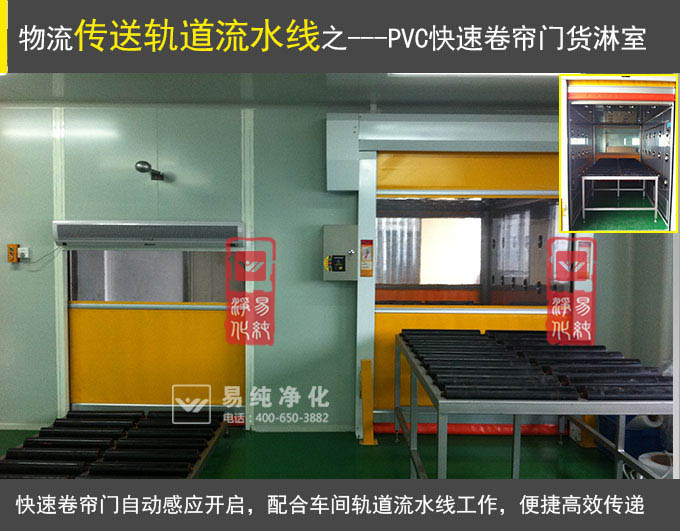4、快速卷簾門流水線貨淋室(自動感應控制快速卷簾門),流水線可做成整體一條線,門下降時接近流水線,也可將流水線分成三部分;
