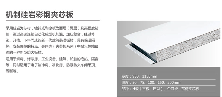 采用硅巖為芯材,鍍鋅或彩涂板為面層(兩層)及高強(qiáng)度粘劑,通過(guò)高速連續(xù)自動(dòng)化成型機(jī)加溫、加壓復(fù)合,經(jīng)過(guò)修邊、開槽、下料而成的新一代建筑裝潢板材,具有保溫隔熱、安裝便捷的特點(diǎn)。是同類(夾芯板系列)中耐火性能最強(qiáng)的一種新型防火板材。