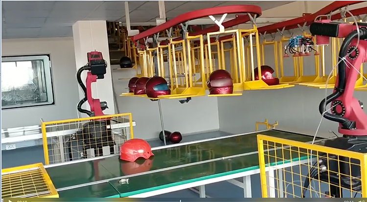 頭盔正在自動線上噴漆